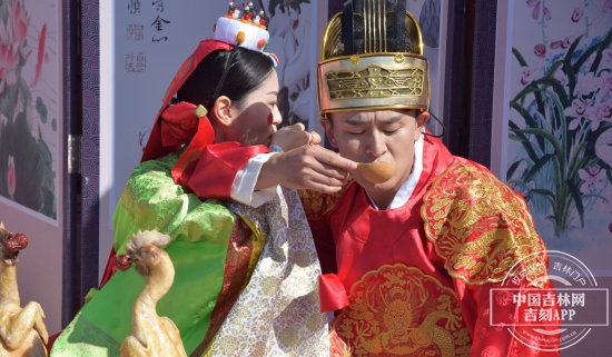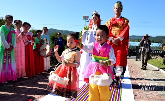 秋日的龙井天高云淡,稻谷飘香,到处都是一派喜人的丰收景象。走进明东村,俨然走进了陶渊明的世外桃源,这里花团锦簇,绿树成荫,黛瓦白墙的朝鲜族民居掩映在绿树鲜花中,平整整洁的沥青路纵横交错。村里按照摄影家们的要求,组织了一场朝鲜族传统民俗婚礼。“新郎”“新娘”身穿朝鲜族婚礼的服饰,在村民的欢呼声和祝福声中,浪漫牵手,喜结“良缘”。整场婚礼热闹、喜庆,且原生态,这令摄影家们激动不已,他们纷纷按动快门,定格精彩的瞬间。“真的很过瘾,不虚此行啊!”摄影家蒯正东赞不绝口。