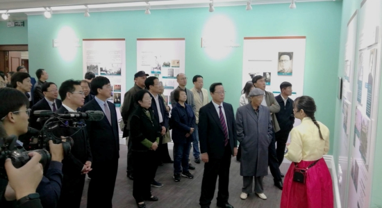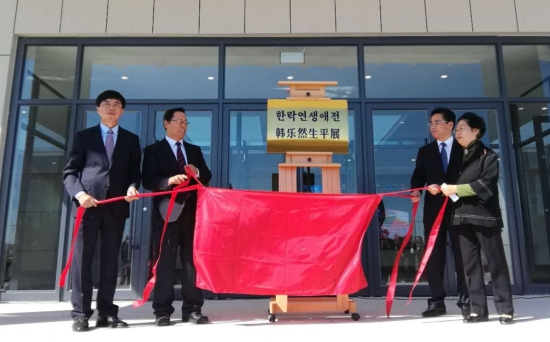 原中央统战部副部长、国家民委主任李德洙,延边州委常委、宣传部部长金基德,延边州政协副主席、龙井市委书记安明植,韩乐然女儿韩健立女士,共同为“韩乐然生平展”揭牌。